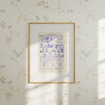 Cette illustration rend hommage aux cabinets de curiosités classiques avec une touche de mystère. Dans cette armoire soigneusement dessinée à l'encre bleue, on découvres des pierres précieuses, des fossiles anciens témoins du passé, des plantes gracieuses qui glissent autour des objets et un chat paisible qui observe la scène.